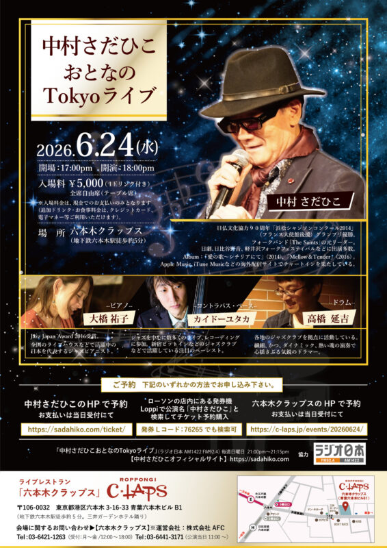 来る6月24日(水)六本木の大人のライブハウス「六本木クラップス」で開催のワンマンライブ。